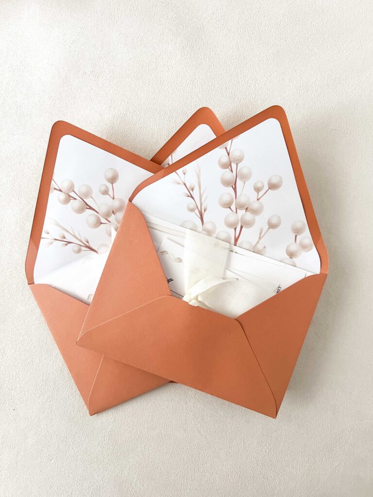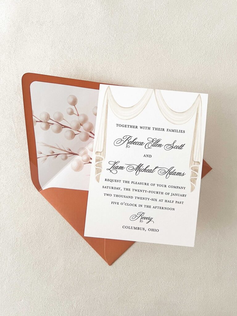 I designed the main invitation card with an illustration of draped fabric. This is the same ethereal draping that guests would see during the ceremony at Revery. For the envelopes I chose a pop of terracotta with a botanical liner.