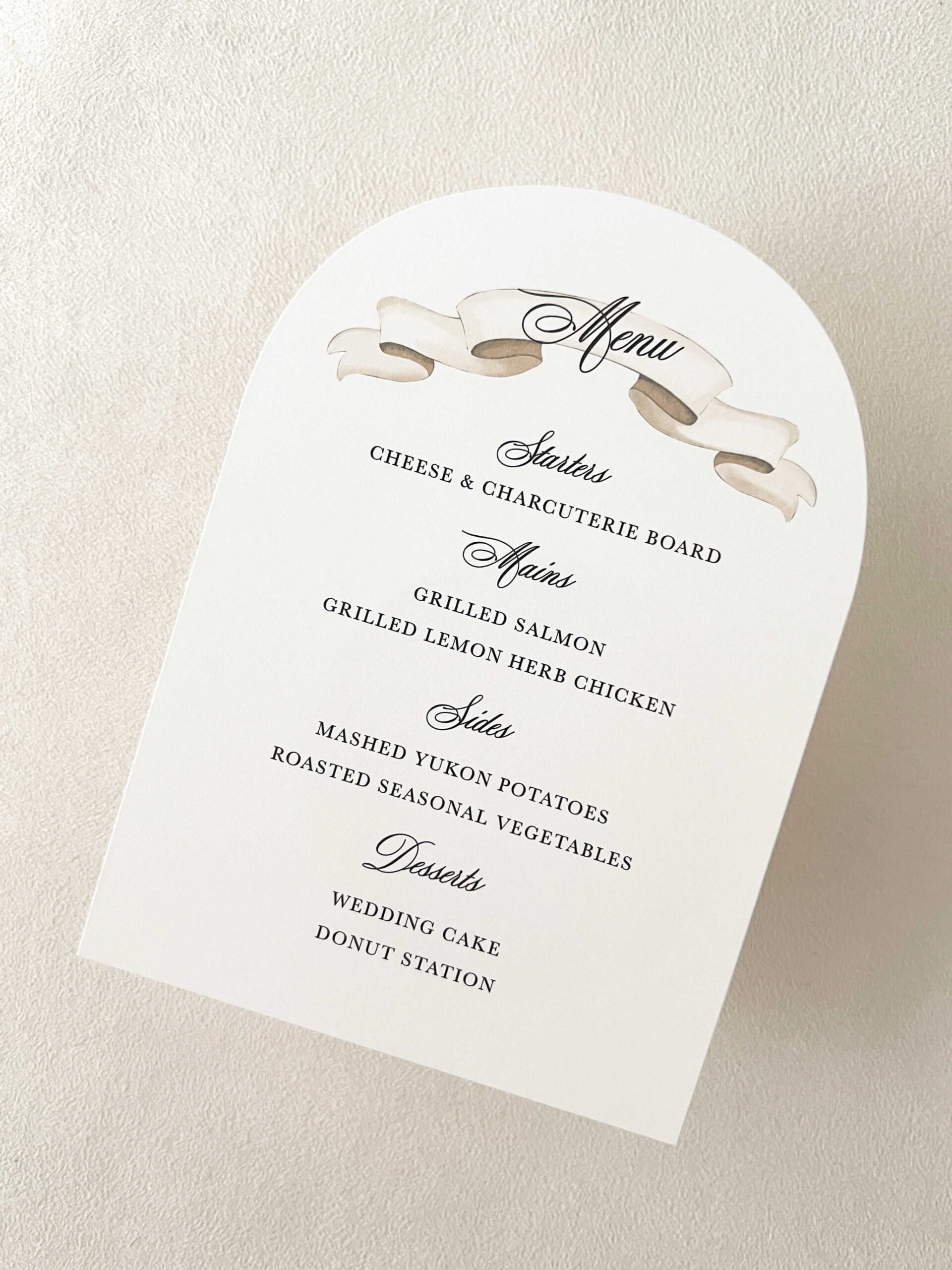 For this wedding, I designed a die-cut menu card with a ribbon banner at the top. The arch shape and organic details tied back to the invitation suite, keeping the look cohesive from the moment guests received their invitation to the moment they sat down at the table.