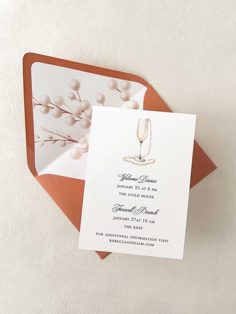 The RSVP card carried the same soft, elegant feel with an illustrated bow detail at the top. And finally, for the details card I added an extra touch of elegance: a champagne flute illustration wrapped in pearls. It helped set the tone for the refined, luxurious feel of the entire wedding.